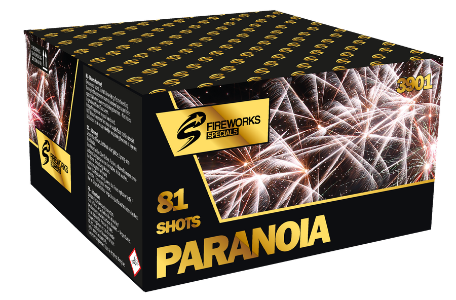 Paranoia ist eine Feuerwerksbatterie mit 81 Schuss und 20 mm Kaliber, die über ca. 52 Sekunden farbige Sternbuketts in einem I‑Shape‑Fächer abfeuert. Ideal für Silvester, Partys und mittelgroße Feuerwerksshows.