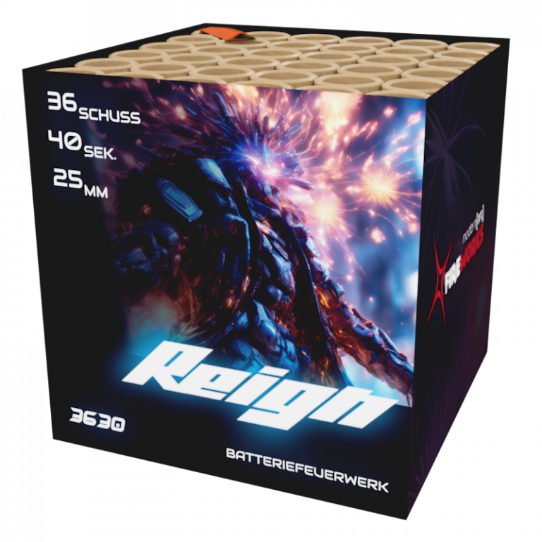 Reign ist eine dynamische Feuerwerksbatterie mit 36 Schuss und 25 mm Kaliber, die über ca. 40 Sekunden kraftvolle, farbige Effekte in den Himmel schießt. Perfekt für Silvester, Partys und visuelle Highlights in jeder Feuerwerkshow.